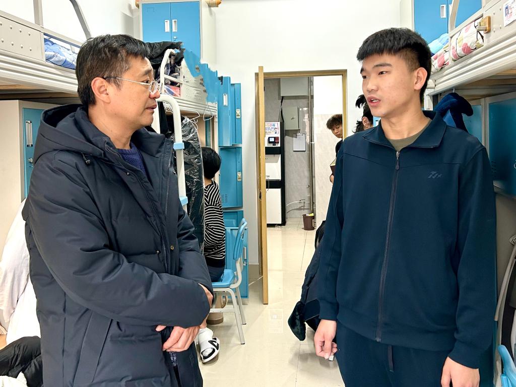 在宿舍中,艾衍辉与同学们深入交流,关注同学们的生活状况,询问是否有生活学习上的困难和需要帮助的地方,了解他们的期末考试安排和复习情况。同时,对同学们在树立文明形象、维护环境卫生、遵守规章制度等方面提出了要求。